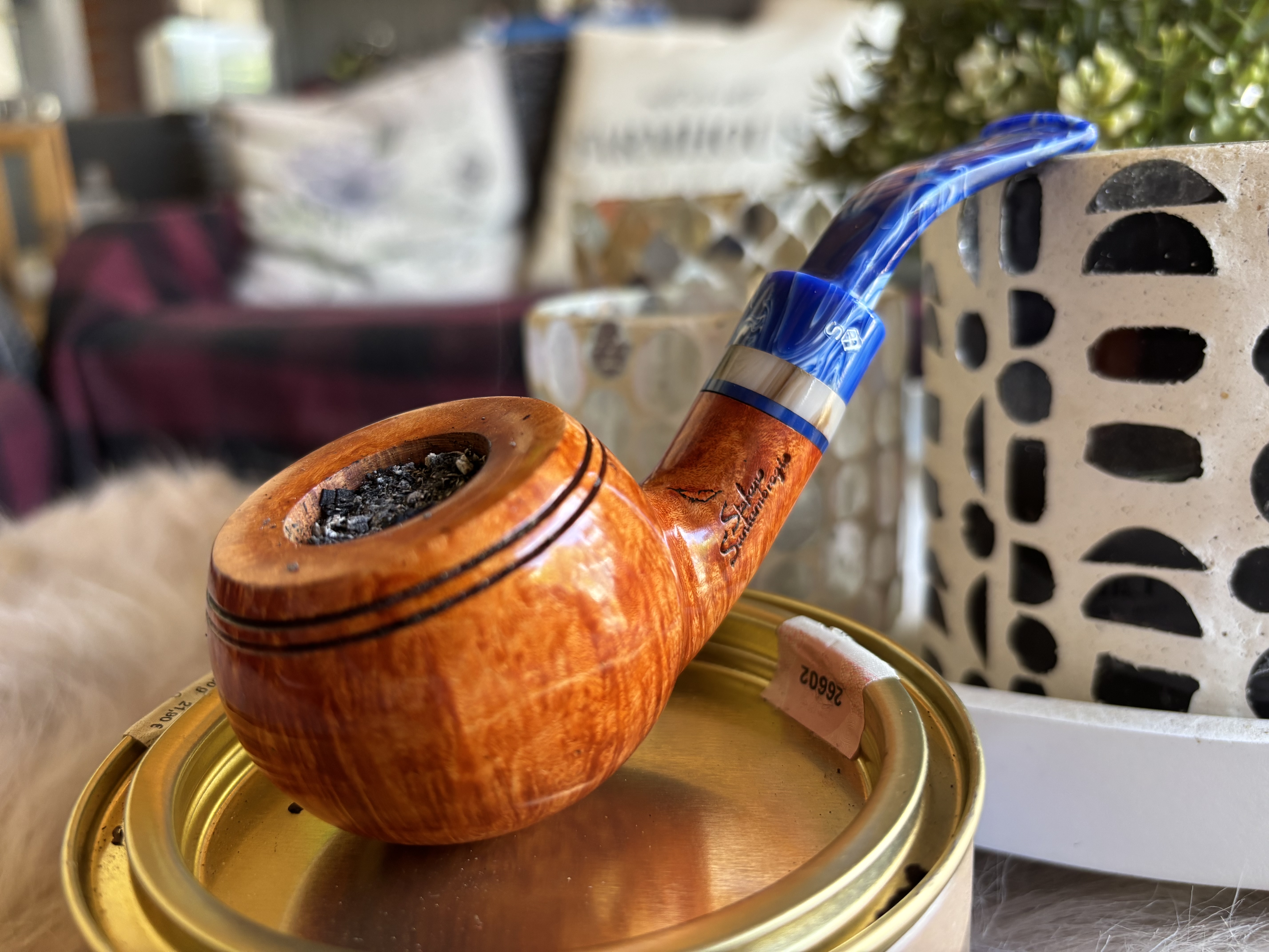 The marbled blue acrylic stem, with its elegant light veining, creates a striking contrast with the pipe’s body. The decorative shank extension in ivory and blue tones adds further refinement, enriching the overall look with a sophisticated detail.